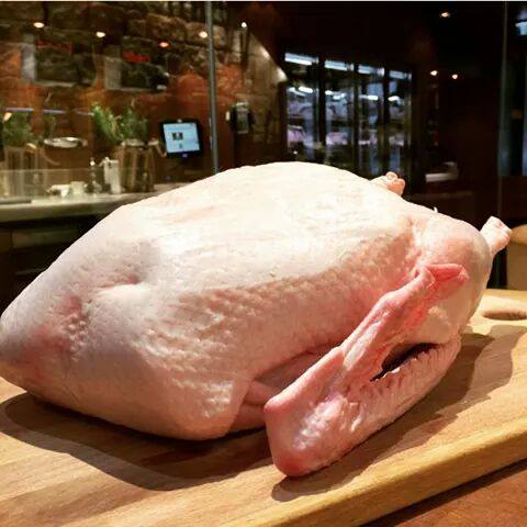 This image shows a raw, whole goose from UGoose laid out on a chopping board, as supplied. These geese are bred, hatched, raised, and hand-processed on the Mackenzie family’s farm in Gippsland, VIC. With no chemicals, no hormones, and full access to clean pasture, these birds develop deep, natural flavour and richly coloured meat.