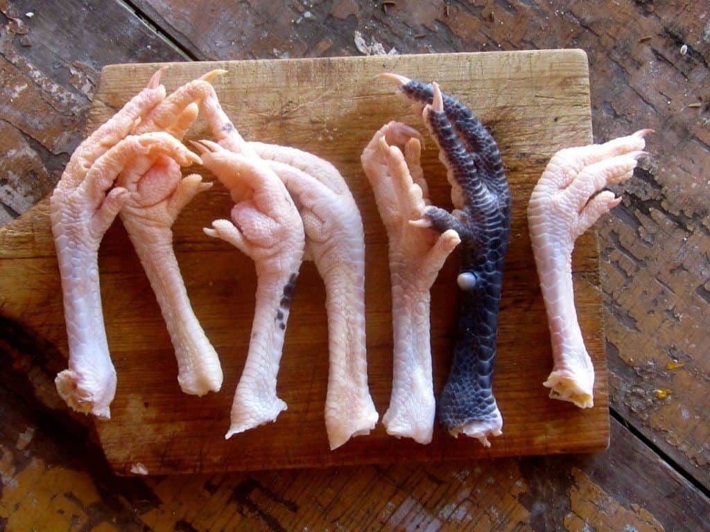 A selection of heritage chicken feet in various natural colours, displayed on a wooden board. These feet are slow-grown and packed with collagen, ideal for creating nourishing and flavourful broths