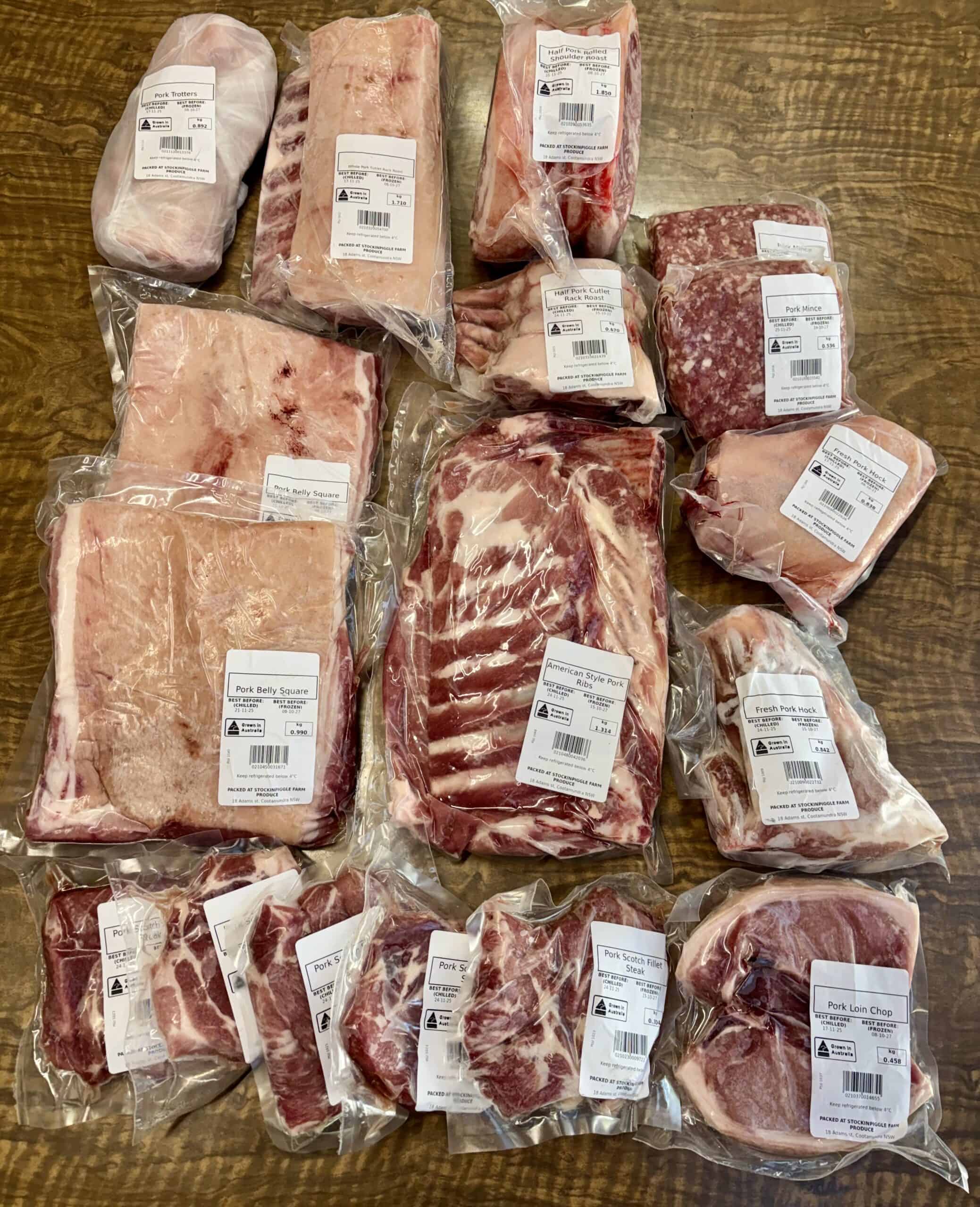 Approximately 10kg of premium mixed pork cuts. Boxes may include a selection of pork roast (leg or shoulder), loin chops, pork belly, American-style ribs, tenderloin, diced pork, pork strips, mince, and sausages. Exact contents may vary depending on the animal and availability.